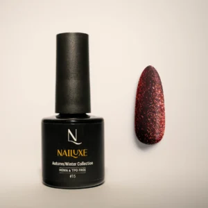 #15 Golden Brown – Luksuzna smeđa nijansa obogaćena zlatno crvenim šljokicama koje daju glamurozan ali uravnotežen sjaj. Savršena za blagdanske manikure i klijentice koje vole efektan shimmer.
